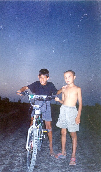 C'era ancora luce bastante, quando sono stato di rientro in Moynak, per fissare in un'istantanea l'immagine di uno dei due bambini che il giorno avanti mi avevano fatto da guida, e che ho ritrovato con un suo amico, sulla bicicletta con la quale mi aveva raggiunto lungo la strada