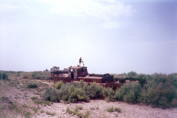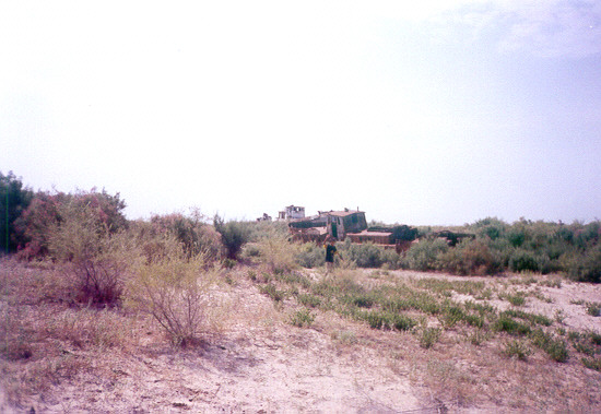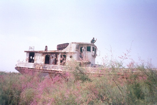 L' immagine del battello nella radura che oltre la strada fronteggia l' Oybek hotel, il mattino del lunedì seguente il mio arrivo in Moynak. |