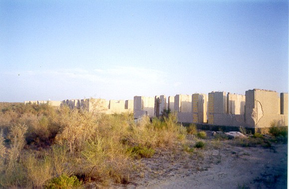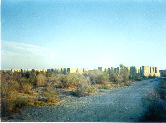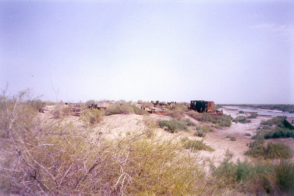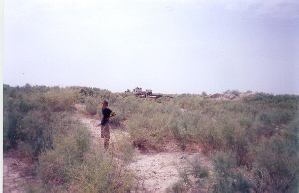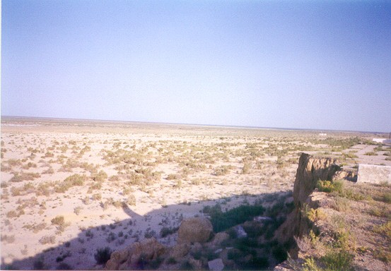 Dal costolone che franava, sottostante, si stendevano a perdita d'occhio la livida sabbia e l'infinità di cespugli, sulla sfondo solo delle pozze costituivano la presenza ancora dell' acqua, dove, mi sarebbe stato detto, si tenta ancora la pesca, di inoltrarsi fino all' Aral ritiratosi a decina di chilometri di distanza.