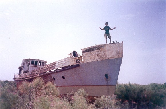 Il bambino mio accompagnatore, sul battello meglio preservato di Moynak |