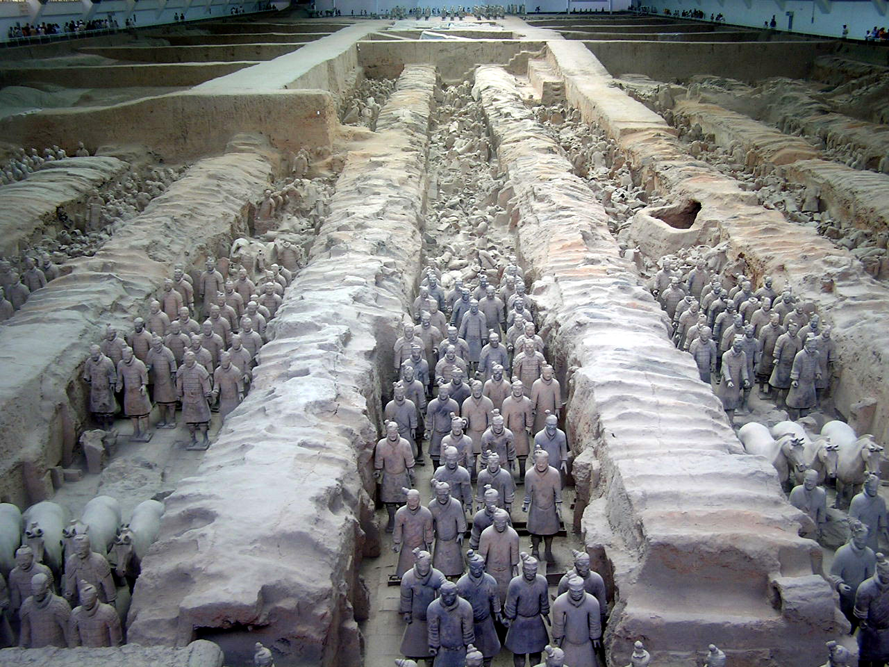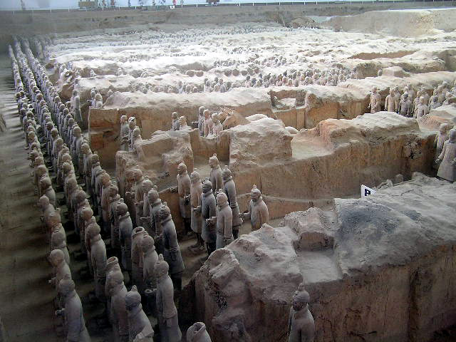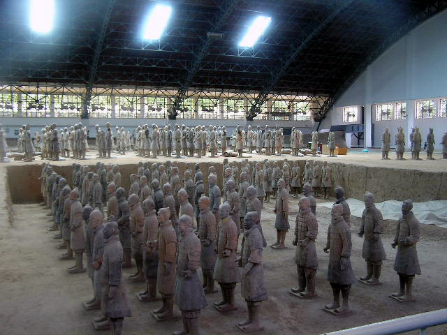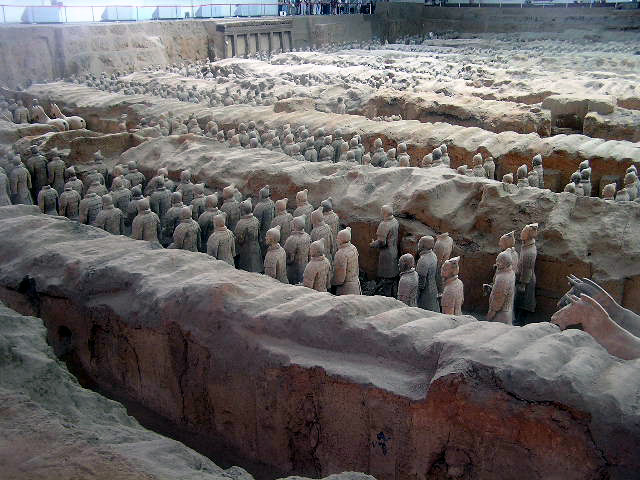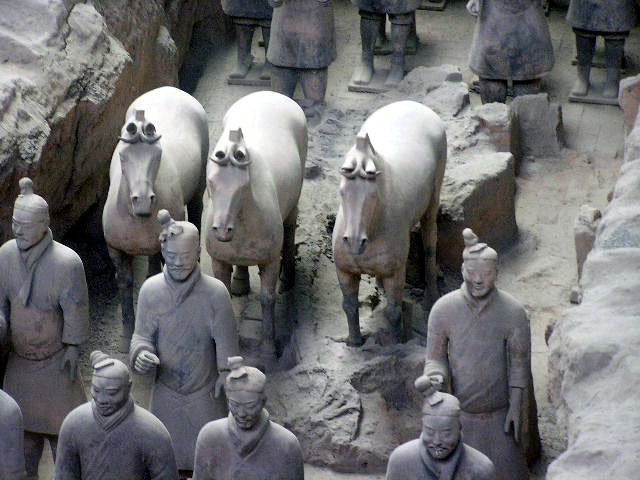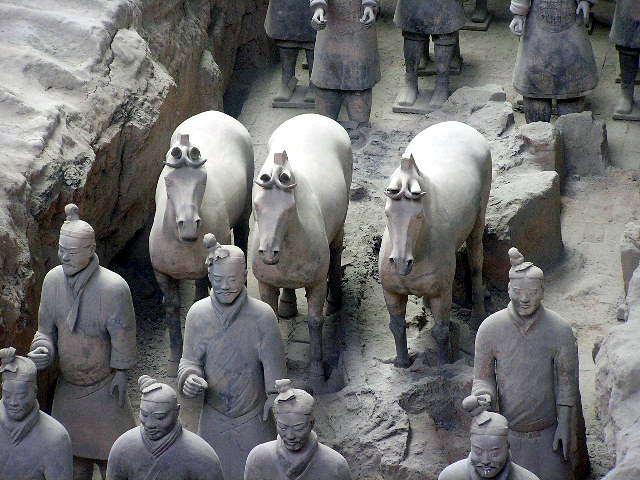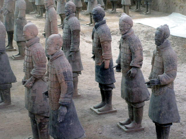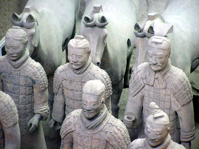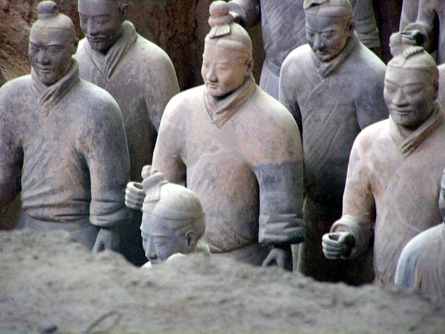 Più che dei risvegliati dalla casualità di scavi rurali, le schiere sterminate dei guerrieri invitti del principe Qin Shi Xian, (Shi Huangdi), sembrano dei ranghi di combattenti ancora in sonno, immobilizzati in armi, nel corso del tempo, dal tragico evento della precoce fine anzi tempo del loro unico e possibile sovrano,- vana, in ogni dove, la ricerca di un elisir di lunga vita,- eppure, in virtù di un vincolo di fedeltà che si protrae oltre quella sua morte illusoria, pronti da sempre a vincere l'incantesimo della loro sospensione nel moto, per avanzare all' istante, invincibili, come sopraggiunga la voce ultraterrena che li appelli all' evento, ognuno nel rango e nel grado- di cavaliere, di arciere, di balestriere, di semplice e nobile soldato, o di cocchiere al seguito, -in cui l'effigiò per sempre la mano creatrice artigianale.