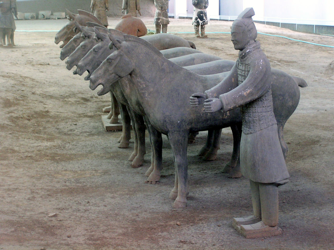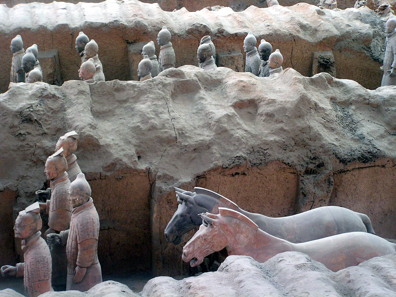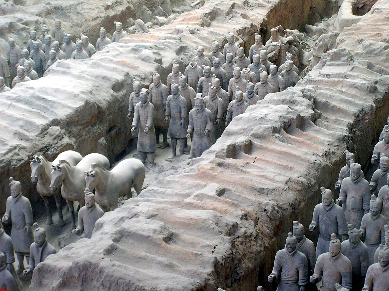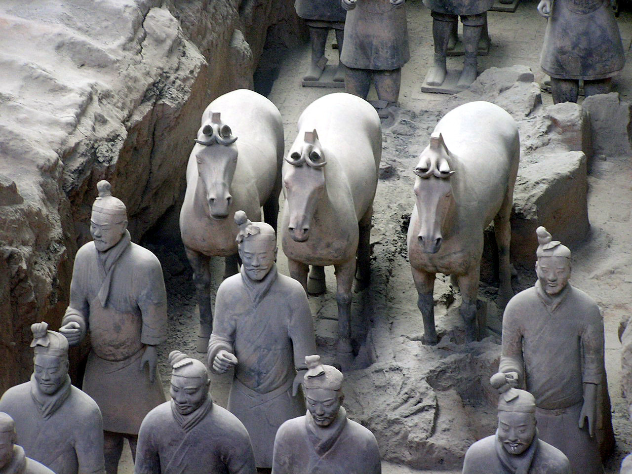 Più che dei risvegliati dalla casualità di scavi rurali, le schiere sterminate dei guerrieri invitti del principe Qin Shi Xian, (Shi Huangdi), sembrano dei ranghi di combattenti ancora in sonno, immobilizzati in armi, nel corso del tempo, dal tragico evento della precoce fine anzi tempo del loro unico e possibile sovrano,- vana, in ogni dove, la ricerca di un elisir di lunga vita,- eppure, in virtù di un vincolo di fedeltà che si protrae oltre quella sua morte illusoria, pronti da sempre a vincere l'incantesimo della loro sospensione nel moto, per avanzare all' istante, invincibili, come sopraggiunga la voce ultraterrena che li appelli all' evento, ognuno nel rango e nel grado- di cavaliere, di arciere, di balestriere, di semplice e nobile soldato, o di cocchiere al seguito, -in cui l'effigiò per sempre la mano creatrice artigianale.