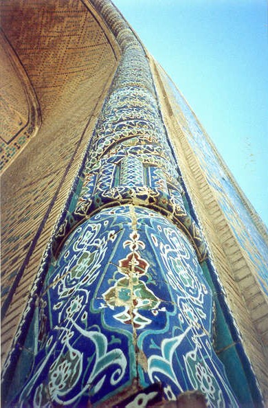 Ahimè, la medersa del grande Ulugh Beg non era più che il riammattonamento rimpiastrellato delle sue ammirevoli forme, in cui la smodatezza timuride fu superata dal conseguimento di un equilibrio corrispondente alla sapienza regnante, cui introduceva lo splendido svolgersi, in torciglioni floreali, del fusto iniziale della cordonatura dell' ivan.