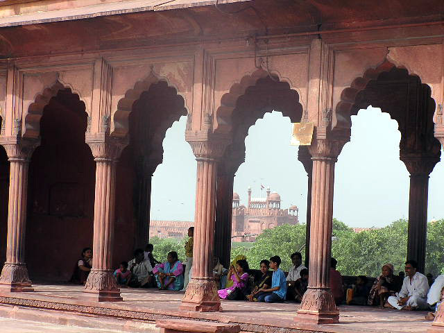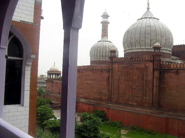 In entrambe, fino a notte fonda, si è internato il clamore dei canti e degli appelli alla preghiera dei muezzin della moschea trapanando anche i plug che ho infilato nelle orecchi; ma le finestre danno luce sulla vista della moschea, e il canto inesausto ha esaltato la sensualità delle mie membra con la mia spiritualità religiosa. Ma una volta che mi sono ritrovato con i miei bagagli nella stanzetta voluta, il raggiro che mi era stato intentato non era ancora un capitolo chiuso: restava ancora da inscenare la sequenza del riscatto. Convenivo con l'albergatore sul da farsi, gli chiedevo che mi assicurasse per l'appunto un conducente di ricksciò, ammaestrandolo in modo che mi riconducesse alla sede di quella agenzia d'affari, che stava indicata sul foglietto della prenotazione alberghiera: dove preavvisato dal ragazzo che conduceva il ricksciò, che da lui era volto in fuga dopo avermi lasciato a piedi nel traffico di Delhi, l'agente turistico era già ad attendermi sull' uscio, e mi faceva cenno che entrassi quand'ero ancora in corsa sul riksciò scoperto, dal lato opposto della strada.Erano già pronte le rupie da rendermi. Pur che non procedessi altrimenti, pur che gli rendessi il foglietto di quella prenotazione, di cui sulla sua copia mi esibiva che veniva cancellando i termini. In uno stato di sonnolenza ininterrotta, nel corso della giornata restante ho visitato la grande moschea di Delhi, salendo al suo cortile per il tramite degli enormi portali, che vi immettevano dal clamore dei traffici e dei mercati della Old Delhi. Era meno aerospaziale della moschea smisurata di Lahore, ( per le due moschee a raffronto visivo si offe la seguente Gallery ), nel trapasso di dimensioni tra il cortile, la sala di preghiera, le cupole, i minareti e il muro di cinta, cui in Lahore i minareti sono distaccati agli angoli estremi, dilatando di un respiro immenso lo spazio dei cieli divini che vi è evocato (l'aere celeste evocatovi ).
