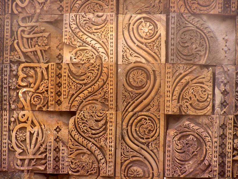 nella pietra con i simboli delle fedi indiane vinte e insottomesse, il