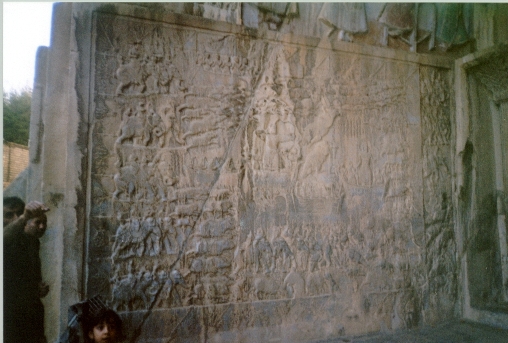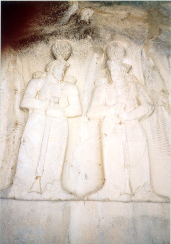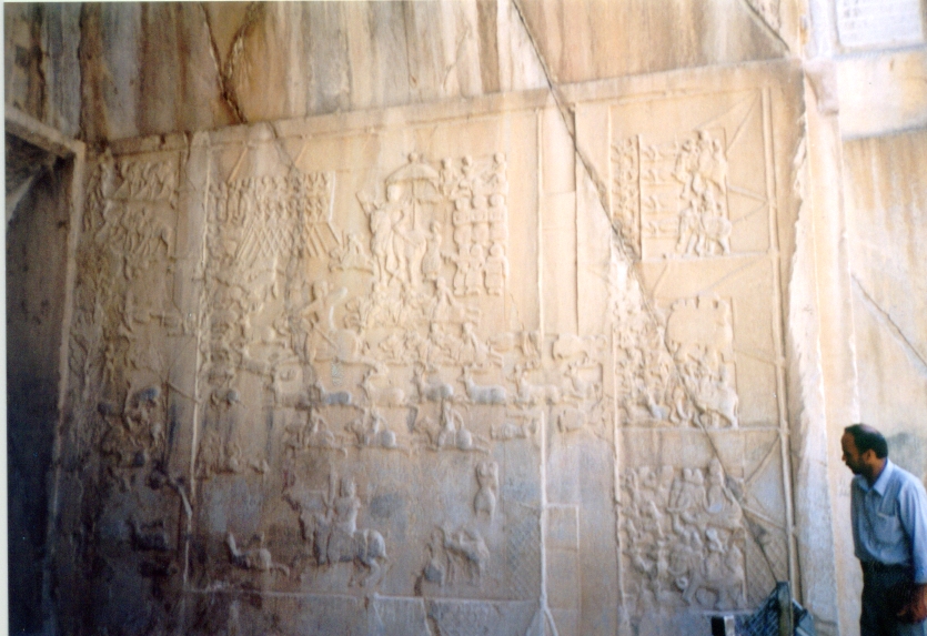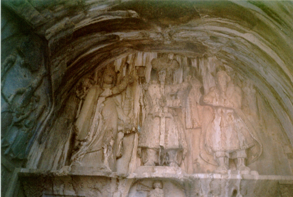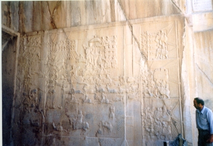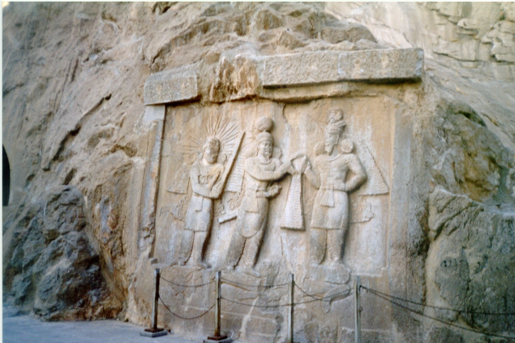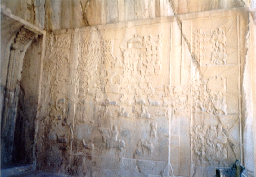 E' vero che accusano una grevità statica le figure superiori, intagliate nella roccia, che nel pannello di ciò che resta dell' ivan alla sinistra della grotta, inscenano l'investitura di Ardashir II da parte di Ahura Madza, che gli offre il diadema della regalità, mentre alle spalle del sovrano Mithra radiante tiene un barom, su di un fiore di loto, ed un morto nemico giace ai piedi del dio Ahura e del sovrano,