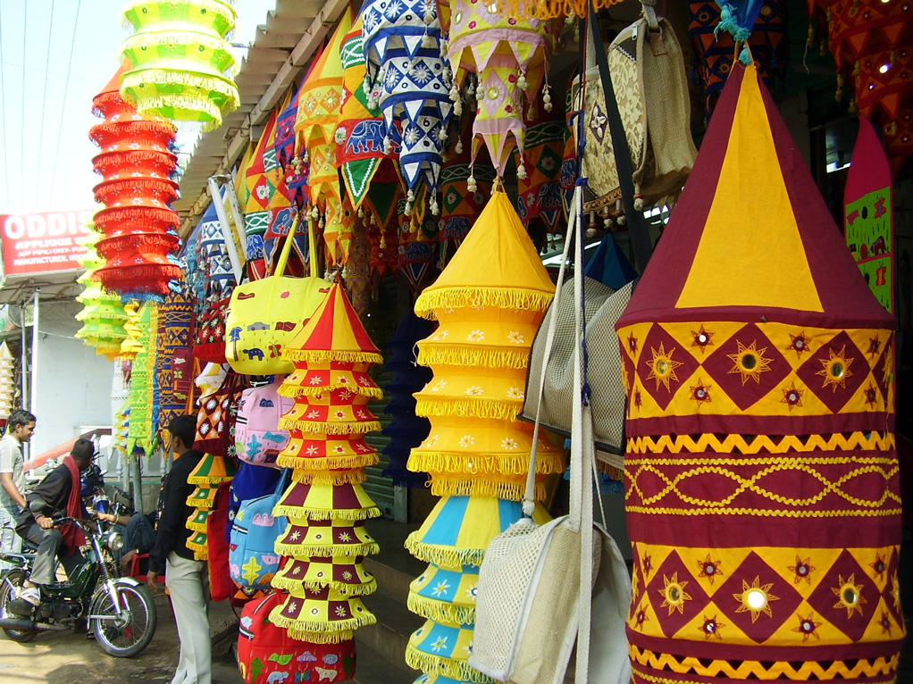 di miriadi di lampade in tessuti multicolori appese ai negozi lungo