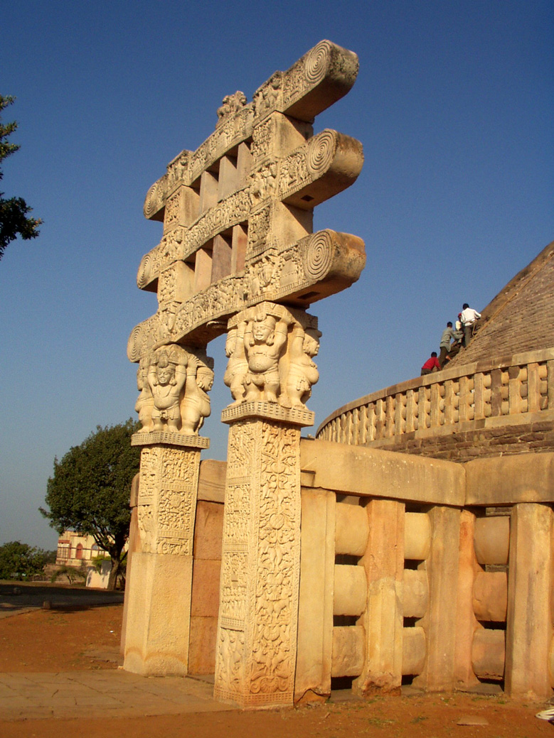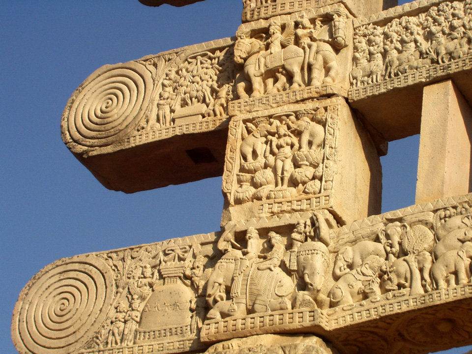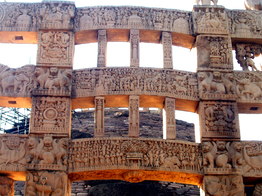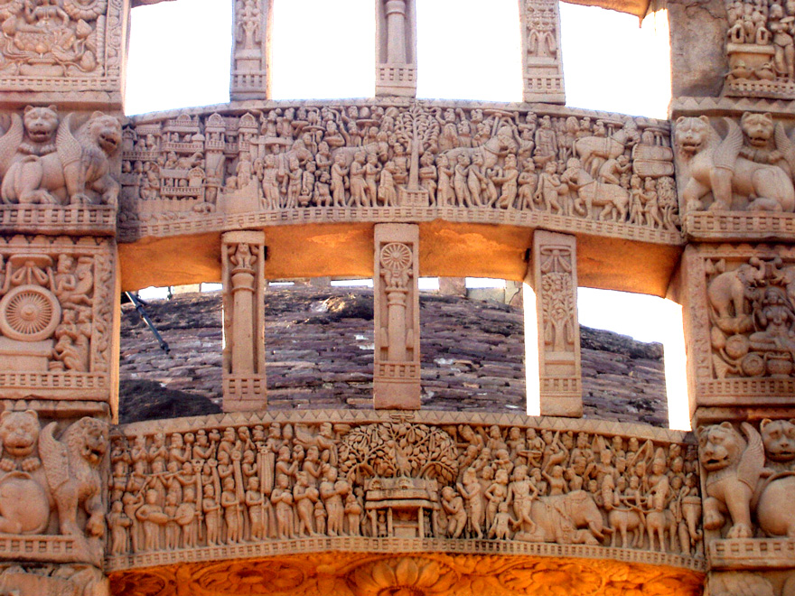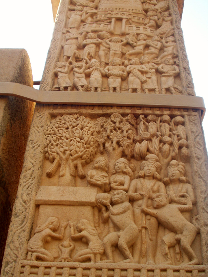 Ciò che lo rendeva in ogni modo partecipe e soddisfatto, era la contentezza di potermi additare le figure di dvarapala, dei guardani divini effigiati nei basamenti dei pilastri del torana, forse memore dei dikpala del parshvanata temple di Khajuraho.