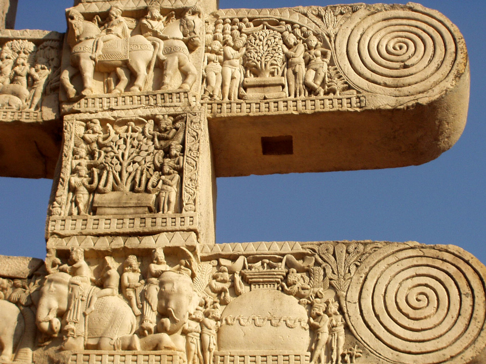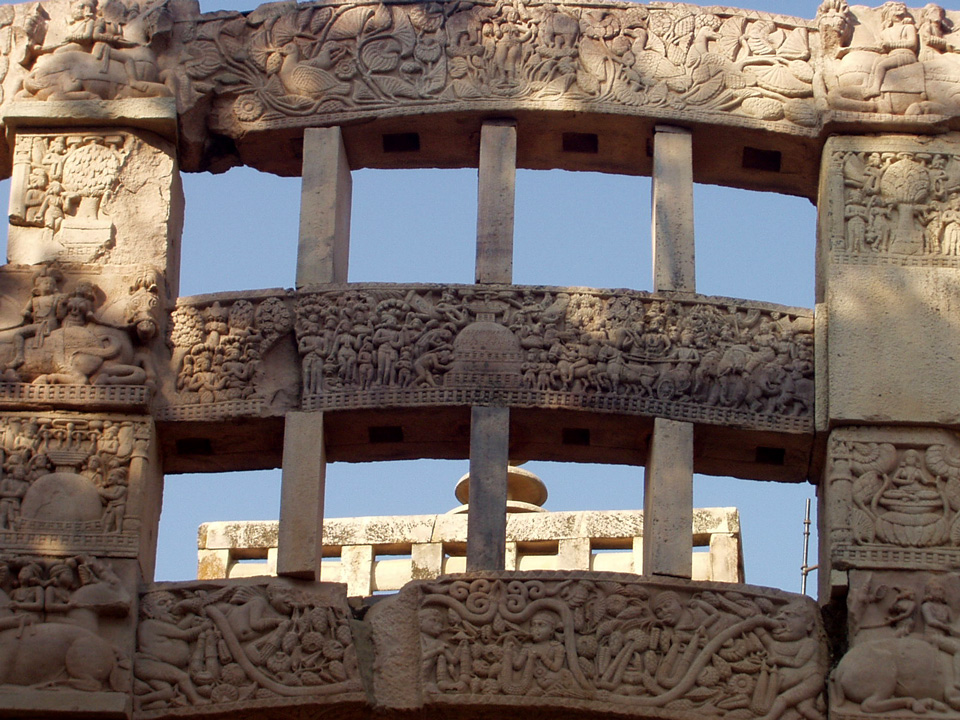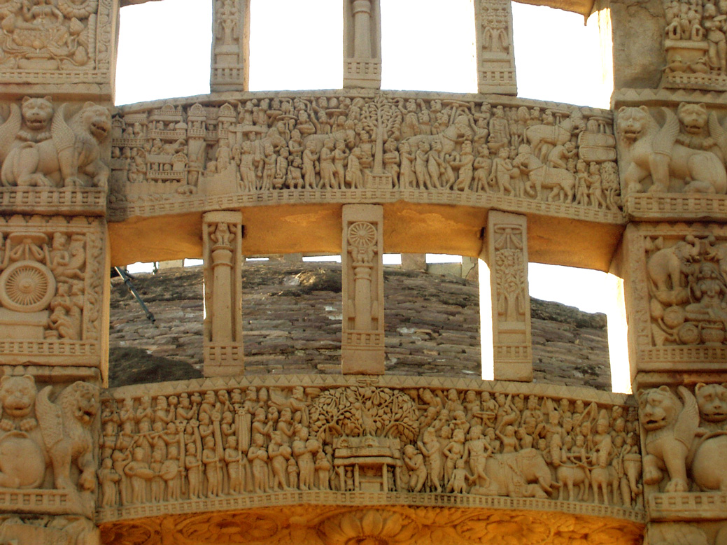 dirigevamo quindi al torana orientale, Insieme ad una terna di colonnine contraddistinte dal capitello di Asoka, con il tricipite leonino soggiacente alla ruota del dharma che il sovrano irradiava, i due pannelli sorreggevano l'architrave centrale, che inscenava la grande partenza di Buddha dalla reggia paterna in Kapilavastu. Non è stato facile spiegare a Kallu il senso dell' episodio.