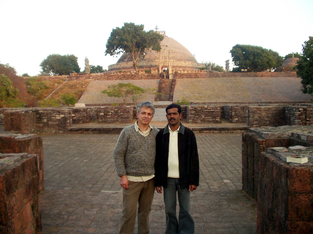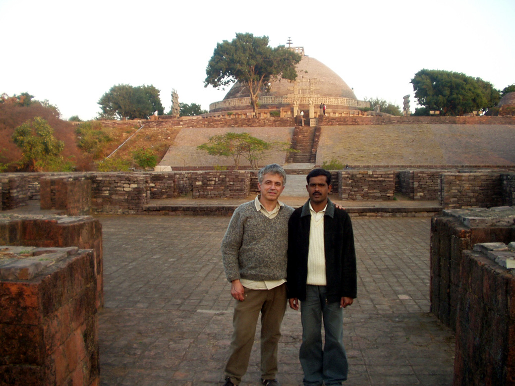 in amichevole attesa, per tutto il lungo tempo che richiedeva il doppiaggio della pradakshina intorno alla stupa per riprodurne le immagini con la videocamera, prima che sul far del tramonto ci avviassimo verso la stupa numero tre, e mi precedesse nel vihara 45 ove era orgoglioso di mostrarmi la statua di Buddha che lo aveva affascinato Lasciato il monastero, le immagini della sua hinduizzazione successiva,