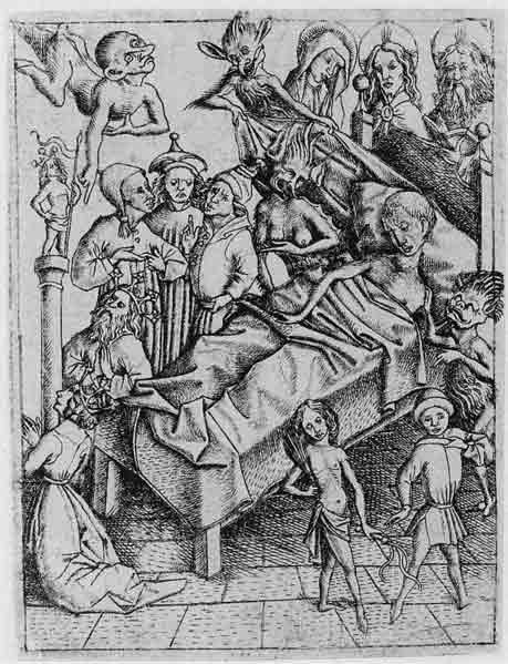 devoluzioni dei beni in opere carittive o nella trasmissione ereditaria ai figli, nuove forme di sepolture sepolcrali, ideali aristocratici umanistici di sopravvivenza nel culto della gloria, della virtù, della ragione), tra le quali, in particolare le " artes moriendi", che nella seconda metà del Quattrocento si erano diffuse rapidamente dalla Renania nel resto della Germania. nei Paesi Bassi, e poi in Francia. Tali "artes", specie nella versione della loro seconda fase, ( 1480-1550), innovando una tradizione già secolare di moralità, che aveva i suoi antecedenti nel Trecento, già nella predicazione di Enrico Suso e negli scritti del Petrarca,- di cui Spinoza possedeva nella sua biblioteca un esemplare del " De Vita solitaria"- non si limitavano ad assicurare l'arte di ben morire, con espedienti sicuri di salvezza terminale, magari ponendo rimedio solo in extremis al corso di una vita trascorsa lontana dallo spirito cristiano, si proponevano altresì di dettare delle regole costanti per la condotta di vita quotidiana dei devoti, le norme di "un'arte di ben vivere" che miravano ad incutere nei fedeli un timore continuo della morte, suscitato dal senso dell'estinzione finale e dalla paura dei castighi infiniti dell'inferno, che servivano a pungolarli ad un'accumulazione continua di meriti validi per l'al di là celeste, con l'acquisizione contabilizzabile di indulgenze, o con la dispensa di elemosine o donazioni e lasciti testamentari. La meditazione della morte diventava in tal modo l' ispirazione di arti di ben vivere per ben morire, trasformando l'intero corso dell'esistenza dei viventi in un tormento incessante, nell'ossessione di fare il bene più per il timore dei castighi eterni, che per amore di Dio, per la Speranza e il Desiderio della Beatitudine Celeste. Così, ad esempio, le " artes moriendi" del XV secolo si affidavano più al timore dell'Inferno, che alla speranza dei gaudi del Paradiso, per indurre al pentimento il peccatore in punto di morte, e per piegare la resistenza al salvamento che in lui era suscitata dall'amore di questo mondo, tanto più intenso nelle circostanze stesse in cui lo veniva lasciando, sulla quale, soprattutto, secondo le rappresentazioni iconografiche delle " artes", contavano gli assalti dei diavoli contro la fede e la speranza del morituro, per rendere vana la discesa al contrattacco dell'intera corte celeste del Paradiso, strenuamente impegnata in suo soccorso